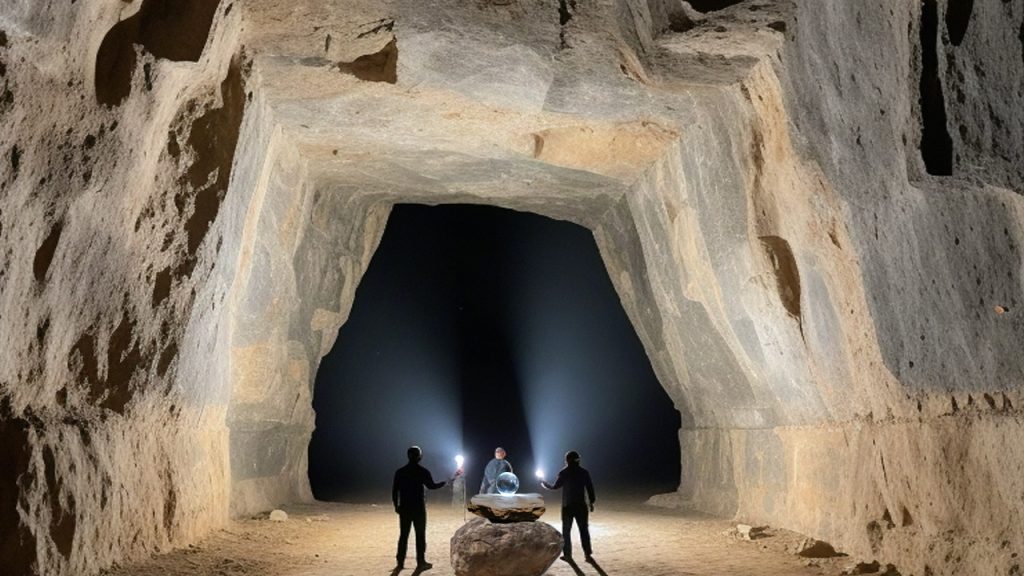 孙同春第一个钻进了洞。洞内空间很大,仅靠洞口射进来的日光和洞内发出幽幽蓝光,也根本看不太清楚。所以,每个人都拿着一把手电筒。四把手电筒的光柱交叉晃动,四个人终于看清了洞内的情形。说是石洞,其实大体更像一个石室,有几间屋子大小,高超过五米。发出蓝光的,是位于石室中心的两块堆叠在一起的两块大石上面,一颗足有排球大小的圆球,正在发着幽幽蓝光。